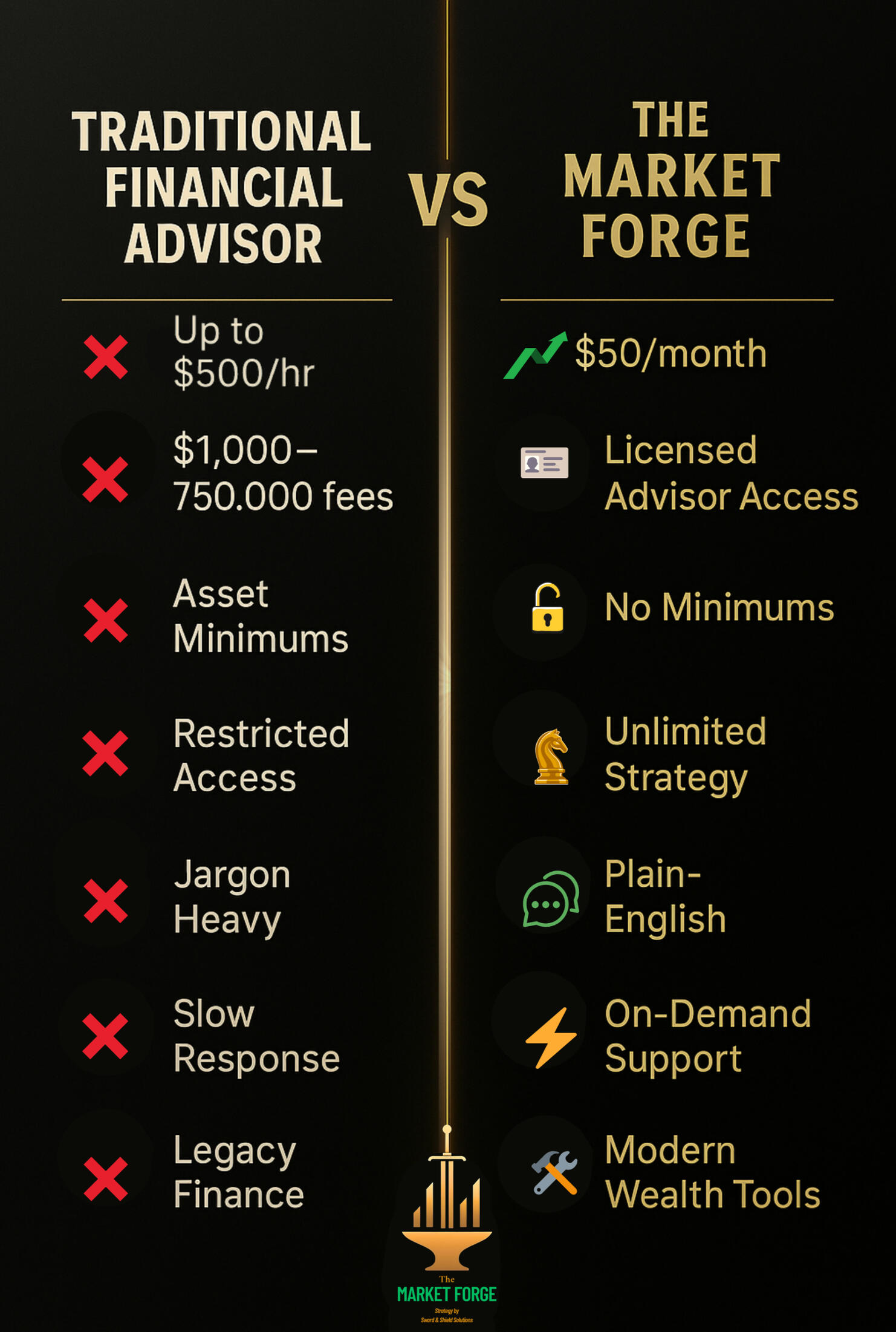 Everyday investors deserve the same level of strategy usually reserved for professionals.⚙️ The Market Forge was created to deliver exactly that — integrating your full financial life into one clear plan, with real access to licensed expertise, and at a price point built for real people — not just those already retired with a nest egg.✅ It’s a simple, straightforward approach designed to actually move you forward.🔄 Today, Sword & Shield handles full-service advisory, while The Market Forge offers a simpler, subscription-based way to access real strategy — built for real people.